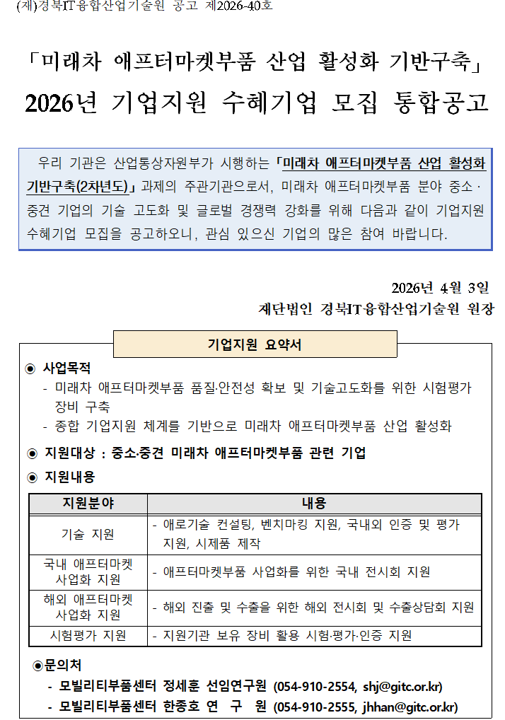 | 제목 | (수정공고)「미래차 애프터마켓부품 산업 활성화 기반구축」 2026년 기업지원 수혜기업 모집 통합공고 | 작성일 | 2026-04-03 | ||||